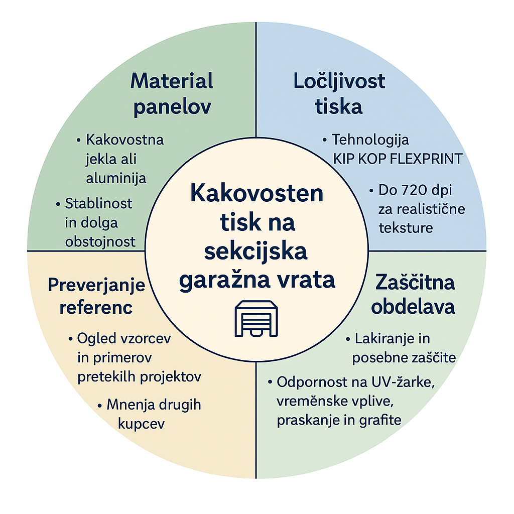 Prednost personalizacije je dvojna: estetski učinek in povečana funkcionalnost. Kakovosten tisk na sekcijska vrata mora biti odporen na vremenske vplive, UV-žarke, praskanje in dolgotrajno uporabo, kar zagotavlja dolgo obstojnost dizajna.
